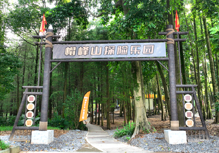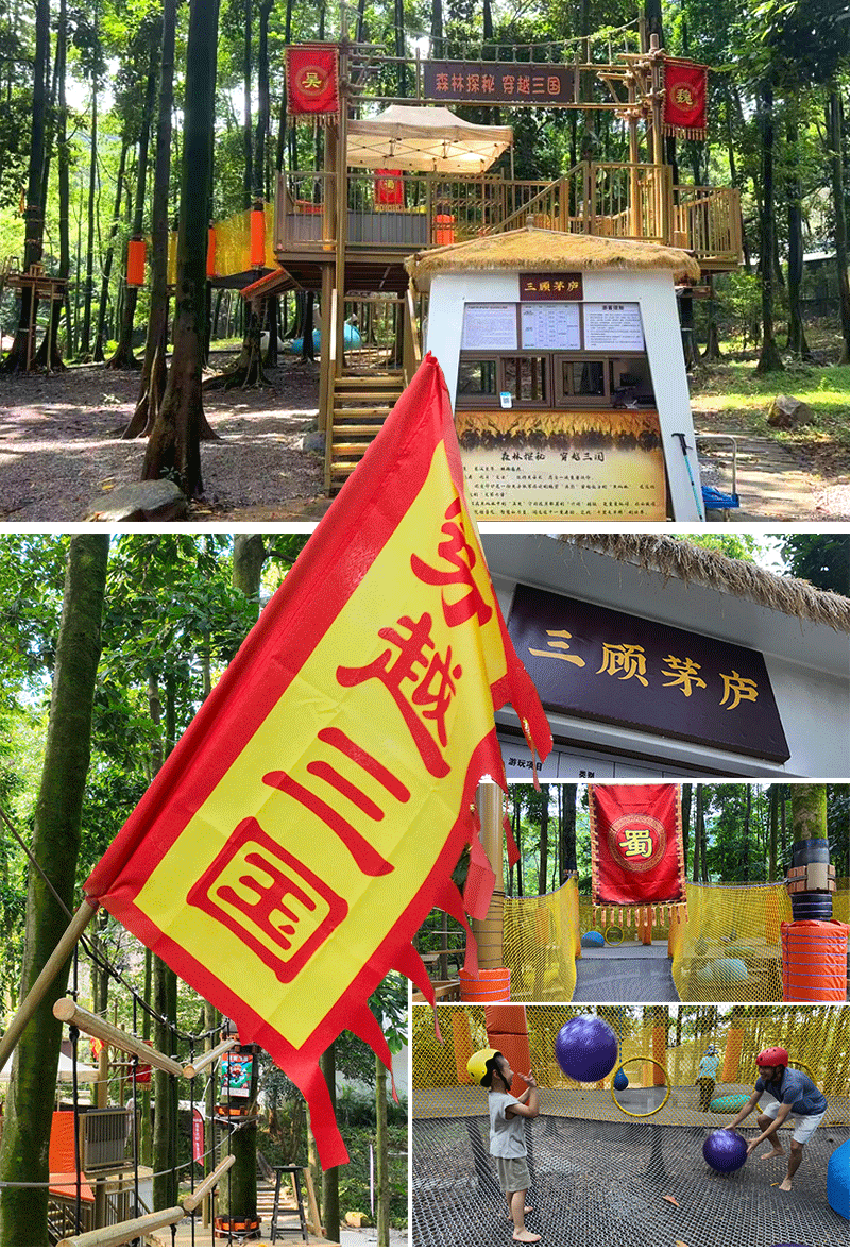 在帽峰山森林景區的茂密林間,三國旌旗林立,一條蜿蜒的“冒險脈絡”正悄然生長——游玩挑戰設施錯落分布于原生樹木之間,這里沒有鋼筋水泥的“人造樂園”,只有藤蔓纏繞的各類步道、藏在樹杈間的趣味蹦網和懸掛在樹木間的溜索……