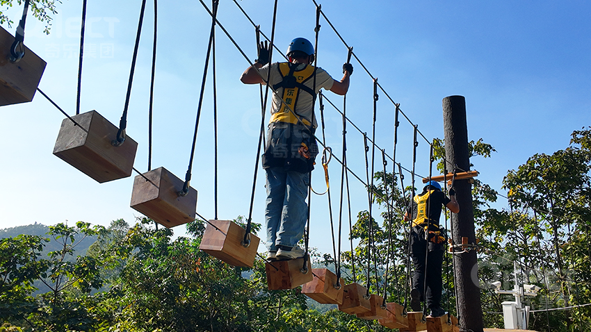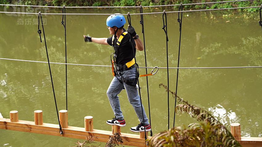 作為入門級(jí)線路,體驗(yàn)線高度適中,環(huán)節(jié)設(shè)置溫和有趣。包含短距離的獨(dú)木橋、蘑菇橋和交叉秋千橋等。它旨在幫助游客,尤其是孩子們,消除恐高心理,建立自信,初步掌握平衡與協(xié)調(diào)能力。