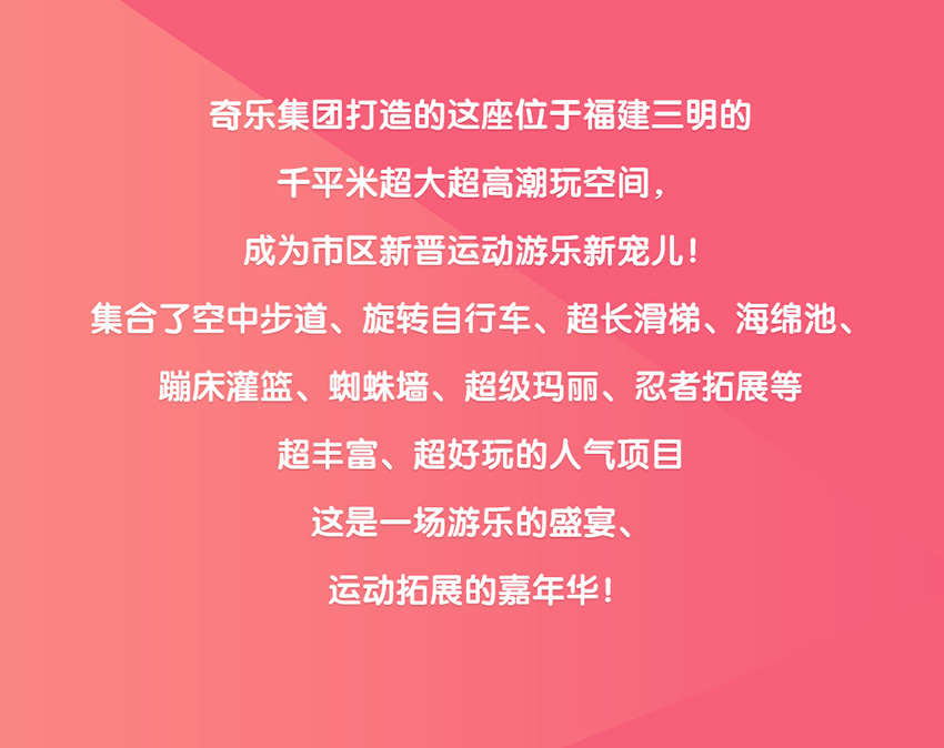 福建三明運動游樂館現已竣工投入運營,各位家長可帶上小朋友一起去體驗一下,同時也可以感受一下奇樂集團對于此樂園的設計理念和品質的把控,也歡迎大家提出寶貴的意見,讓我們能夠精益求精的打造出更好的樂園。