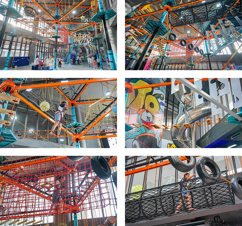 設計了27個不同形態、不同難易的空中步道關卡。能鍛煉大小朋友們的身體協調能力,鍛煉體能、鍛煉注意力。
