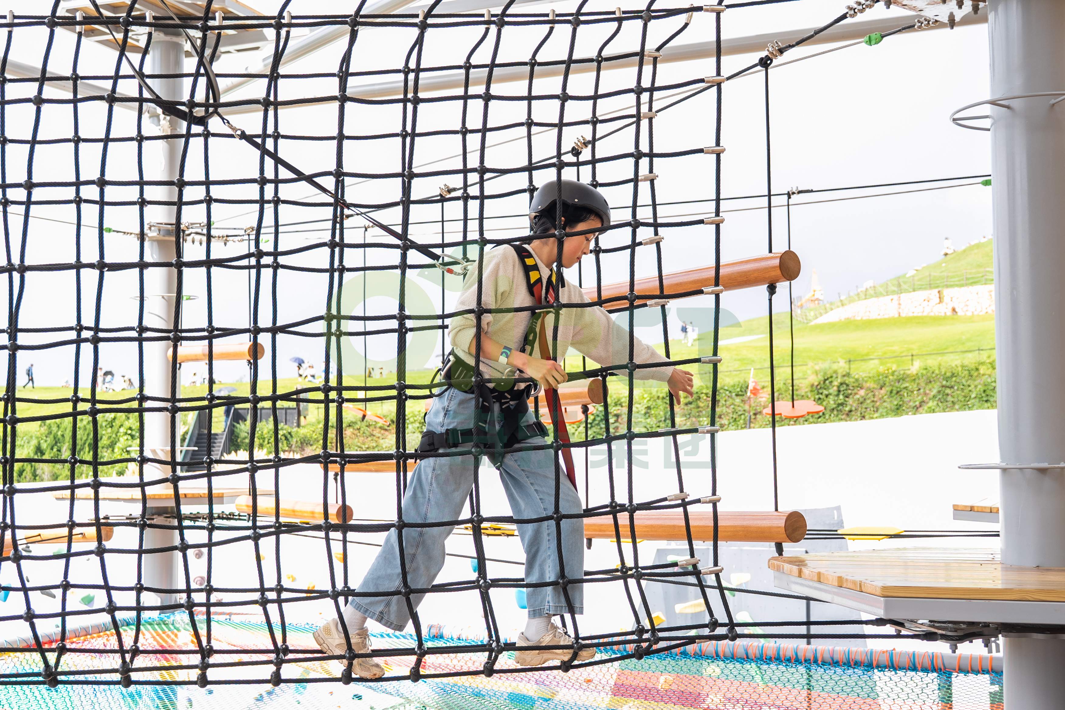 一座大型水晶塔的空中步道總長可達(dá)數(shù)百米,包含百余種趣味關(guān)卡,能夠同時(shí)容納上百名游客進(jìn)行探險(xiǎn)。更重要的是,通過科學(xué)的分層路線規(guī)劃,它能覆蓋從4歲兒童到成年人的全年齡段客群。孩子們可以在低齡區(qū)鍛煉勇氣,青少年和成人則可以挑戰(zhàn)更具難度的攀爬網(wǎng)、高空步道以及令人腎上腺素飆升的頂層速降項(xiàng)目。這種家庭全員可參與的特性,是其能引爆社交傳播和家庭出游市場的關(guān)鍵。