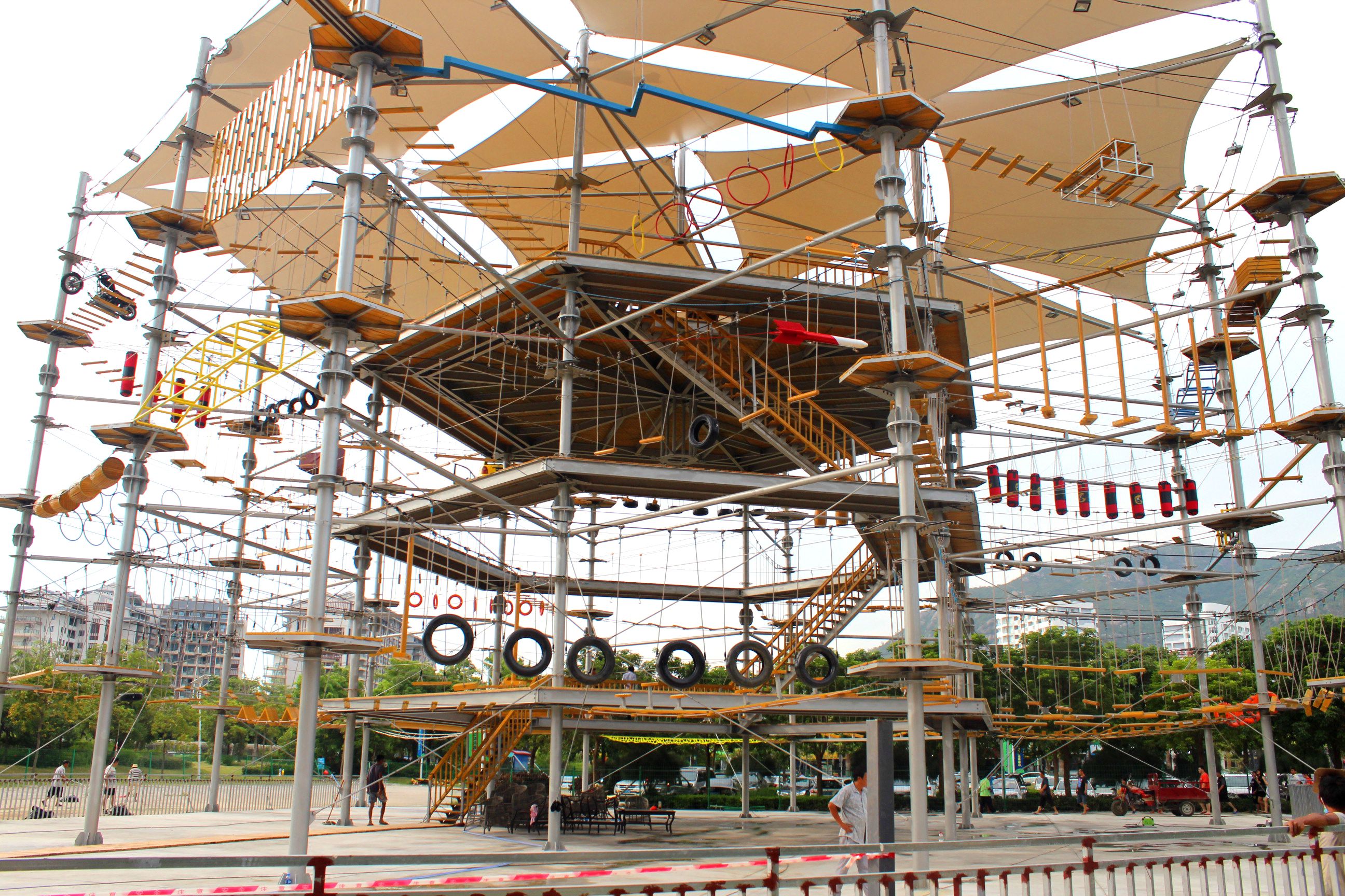 設計階段的防凍考量是根本預防。我們生產的戶外設備采用 “無積水”結構設計:所有平臺表面均有不小于2°的排水坡度;管道類結構如扶手、框架均設計排水孔,直徑不小于8mm;連接部位使用彈性密封膠而非剛性焊接,允許一定的熱脹冷縮。針對兒童樂園設備中的戲水組件,我們標配深度排水閥,可在冬季來臨前徹底排空管道存水。