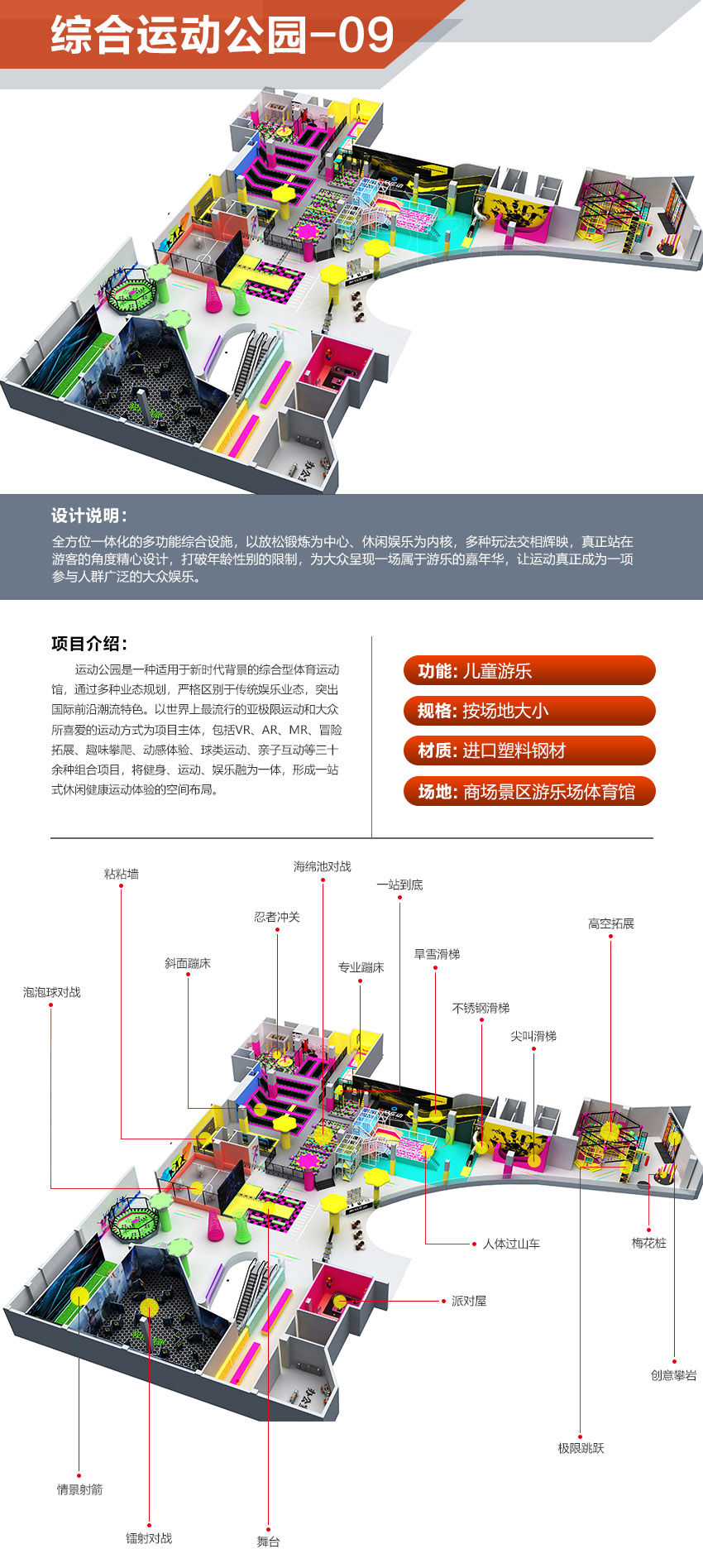 本項目適用于各種親子主題類的樂園,巧妙運用“熊貓”IP造型設計,集拓展、探險、滑道、飛索、蹦極、不銹鋼滑梯、攀巖、爬網等46種不同運動體驗的文化主題項目,結合“大灰熊”IP形象,融入相關設計元素,打造差異化的網紅IP主題性運動拓展營地綜合體。 在裝飾設計上采用竹葉和竹竿的綠色設計元素,以原生態、自然風格為基調,采用原木、繩網和不銹鋼等柔韌度好的生態材料。滿足大眾貼近自然、主題鮮明、寓教于樂的兒童素質訓練教育親子樂園的精神訴求。