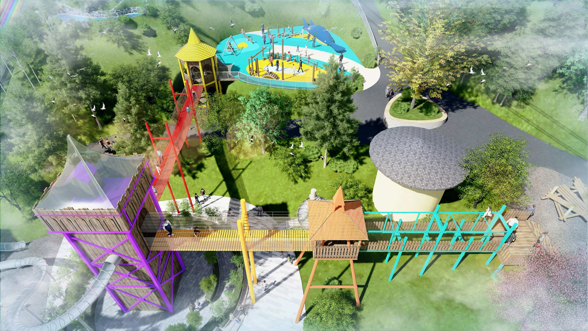 本項(xiàng)目適用于各種親子主題類的樂園,巧妙運(yùn)用“熊貓”IP造型設(shè)計(jì),集拓展、探險(xiǎn)、滑道、飛索、蹦極、不銹鋼滑梯、攀巖、爬網(wǎng)等46種不同運(yùn)動(dòng)體驗(yàn)的文化主題項(xiàng)目,結(jié)合“大灰熊”IP形象,融入相關(guān)設(shè)計(jì)元素,打造差異化的網(wǎng)紅IP主題性運(yùn)動(dòng)拓展?fàn)I地綜合體。 在裝飾設(shè)計(jì)上采用竹葉和竹竿的綠色設(shè)計(jì)元素,以原生態(tài)、自然風(fēng)格為基調(diào),采用原木、繩網(wǎng)和不銹鋼等柔韌度好的生態(tài)材料。滿足大眾貼近自然、主題鮮明、寓教于樂的兒童素質(zhì)訓(xùn)練教育親子樂園的精神訴求。