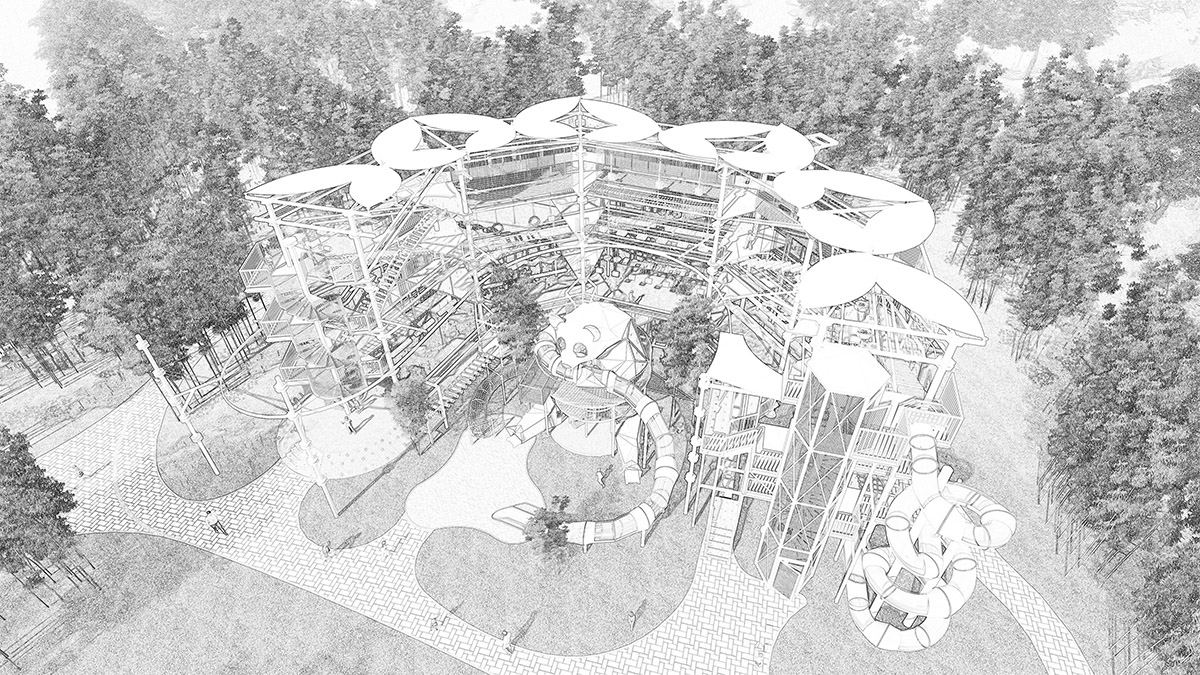 本項目適用于各種親子主題類的樂園,巧妙運用“大灰熊”IP造型設計,集拓展、探險、滑道、飛索、蹦極、不銹鋼滑梯、攀巖、爬網等46種不同運動體驗的文化主題項目,結合“大灰熊”IP形象,融入相關設計元素,打造差異化的網紅IP主題性運動拓展營地綜合體。 在裝飾設計上采用竹葉和竹竿的綠色設計元素,以原生態、自然風格為基調,采用原木、繩網和不銹鋼等柔韌度好的生態材料。滿足大眾貼近自然、主題鮮明、寓教于樂的兒童素質訓練教育親子樂園的精神訴求。