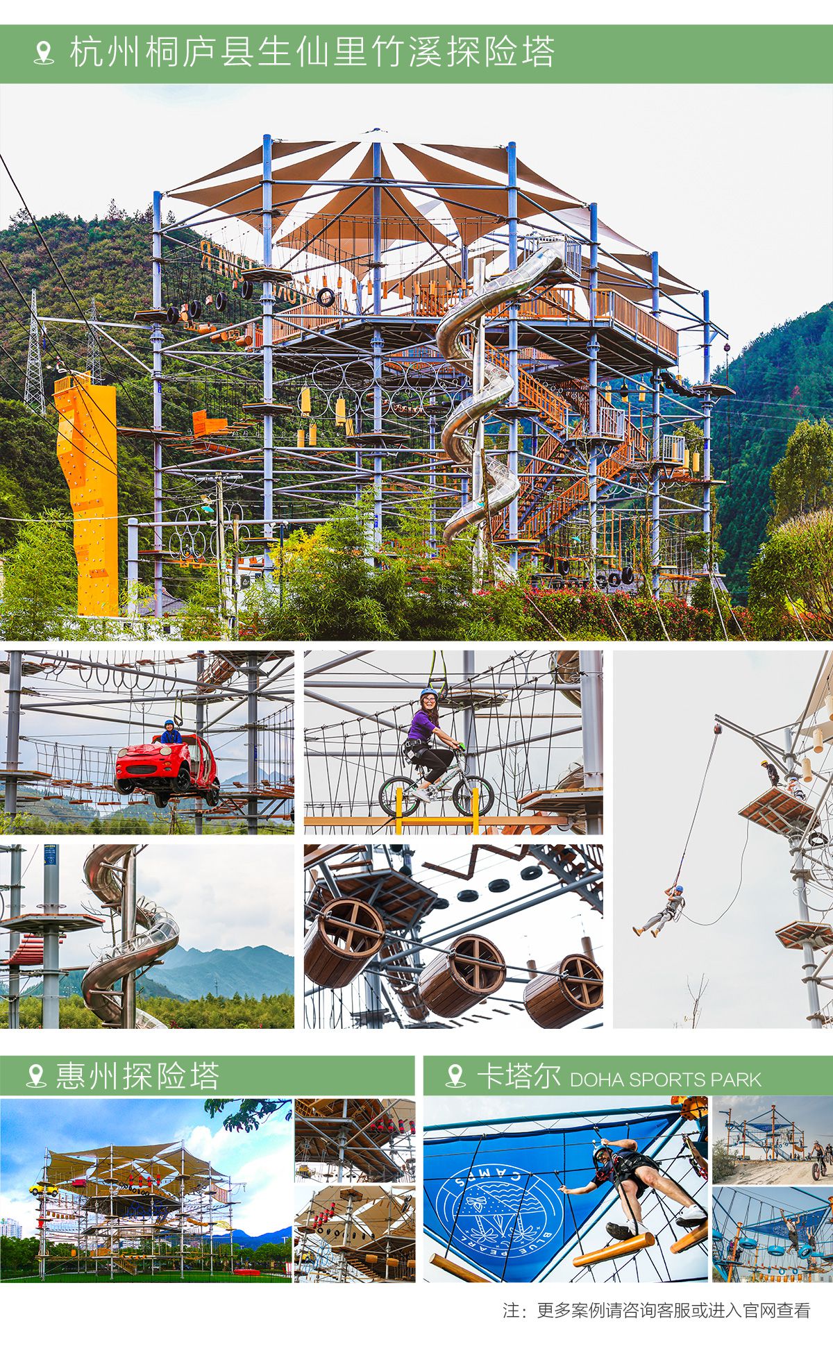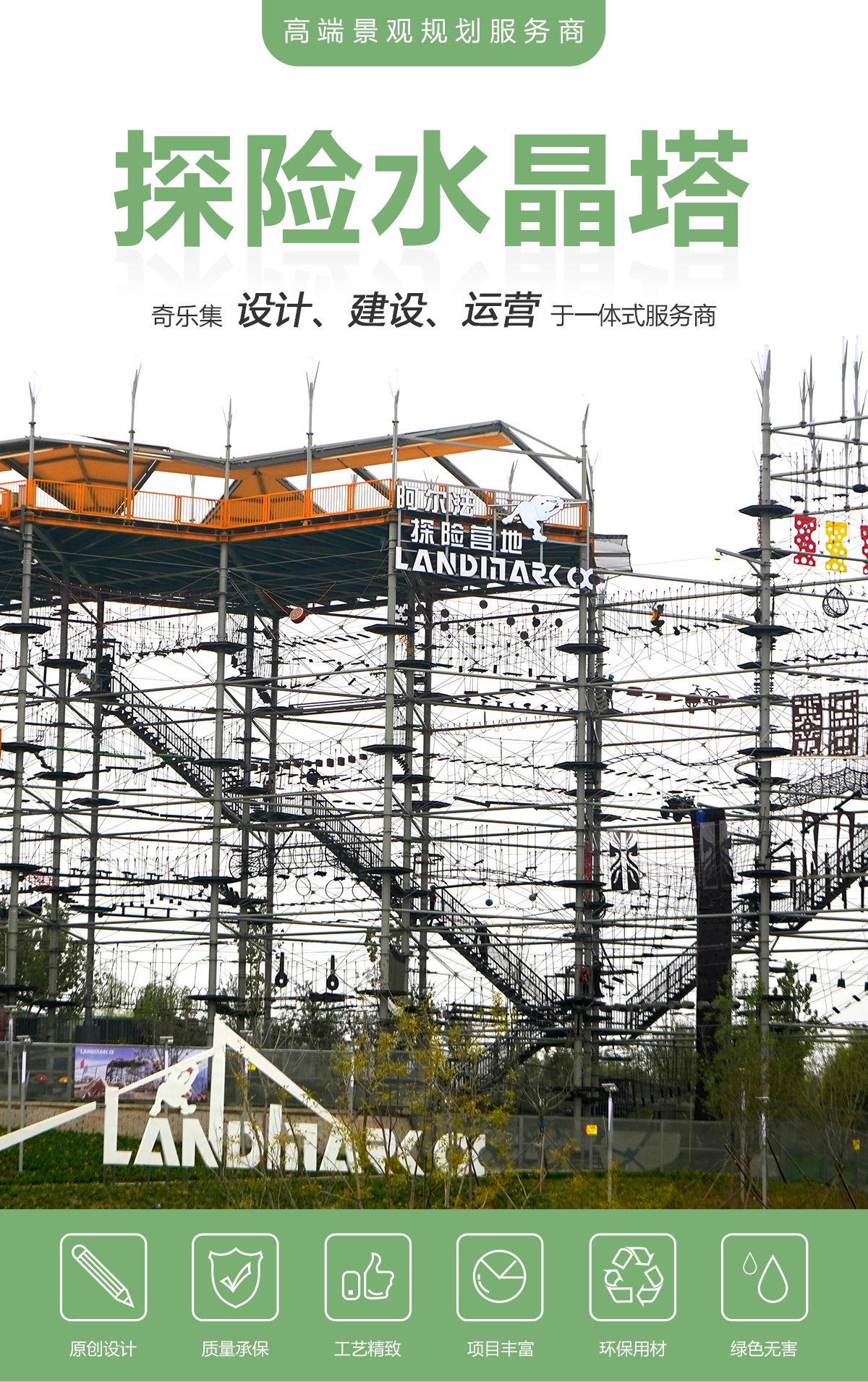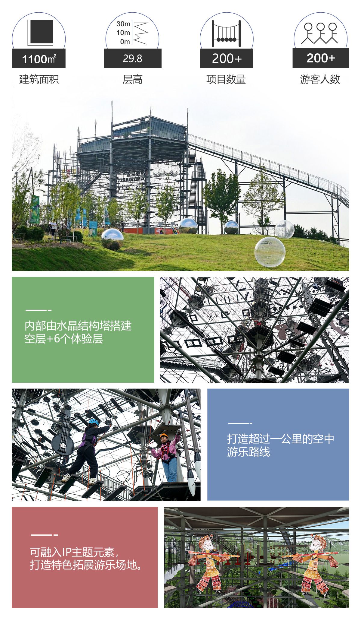 匯集 200 種游樂(lè)步道,適合廣大游客 水晶塔集冒險(xiǎn)、運(yùn)動(dòng)、娛樂(lè)、挑戰(zhàn)于一體的綜合游樂(lè)類項(xiàng)目,通過(guò)在塔內(nèi)設(shè)置并搭建各種難易不同、風(fēng)格迴異、超強(qiáng)刺激的步道關(guān)卡,讓游客體驗(yàn)高空墜落與自由滑翔的快感,感受塔內(nèi)項(xiàng)目攀爬穿越的刺激。水晶塔是一個(gè)創(chuàng)新且極具盈利能力的全新休閑旅游項(xiàng)目,適合建在戶外,也可以建在窒內(nèi)。 晶體結(jié)構(gòu),更穩(wěn)固,更安全 水晶塔采用品體結(jié)構(gòu)設(shè)計(jì),每4根立柱為1個(gè)晶體結(jié)構(gòu),可根據(jù)客戶需求自由組合,晶體結(jié)構(gòu)設(shè)計(jì)更大的增加設(shè)備的穩(wěn)定性、利用率,保證客戶場(chǎng)地的實(shí)用率最大化,立柱之間做連桿支撐,根據(jù)結(jié)構(gòu)設(shè)置觀景臺(tái),可達(dá) 80~1000+m?,可作為餐飲,休閑吧,咖啡吧,酒吧等休閑休息區(qū)域,平臺(tái)下方懸空架連接桿支撐,平臺(tái)可同時(shí)承載 30-1000+人。 搭配我司自主研發(fā)生命系統(tǒng),保障安全無(wú)死角自主研發(fā)自鎖式雙掛鉤,相互交替型安全保障永遠(yuǎn)保證有一個(gè)掛鉤自鎖在鋼絲繩上面,保障安全無(wú)死角。