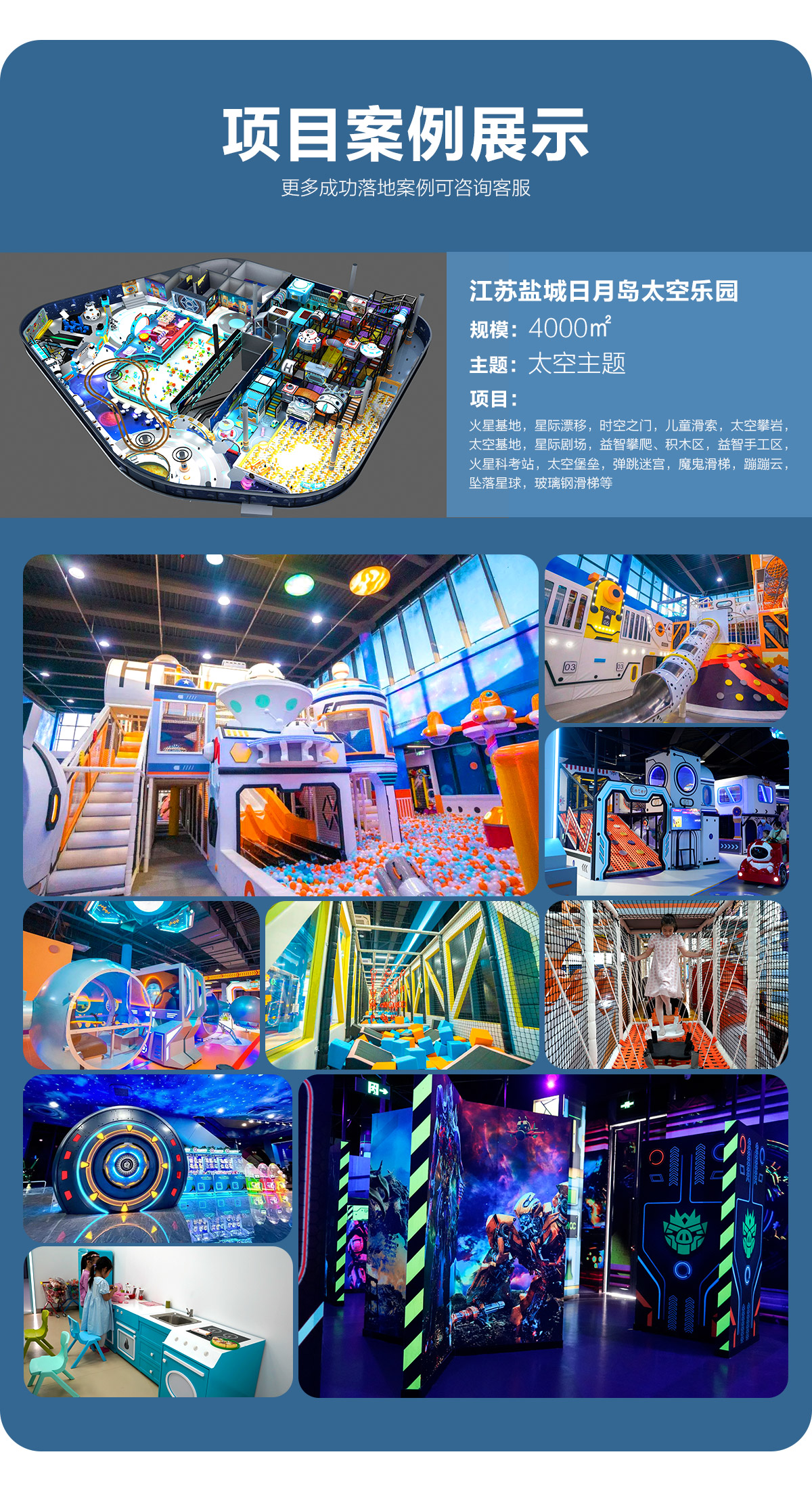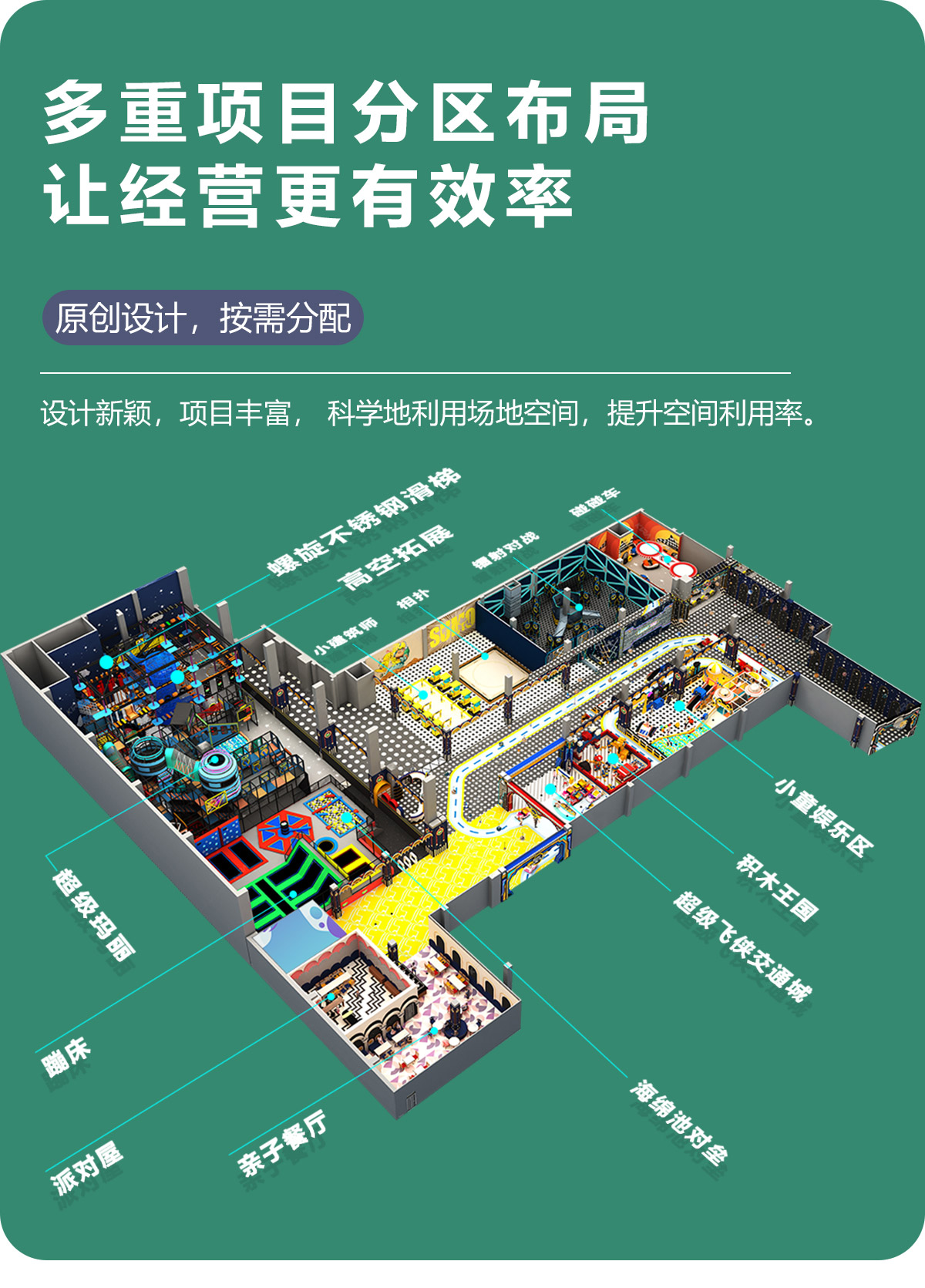 奇樂兒童樂園是包含淘氣堡、親子娛樂中心、彈跳迷宮、攀爬拓展、海洋球池等項目在內(nèi)的一體化游樂設(shè)施。它有別于傳統(tǒng)的單一游樂設(shè)施,相比而言奇樂兒童樂園在項目上更加的豐富,在結(jié)構(gòu)布局上更加的合理,在安全性穩(wěn)定性上更有保障,在收益渠道上更加廣闊,是目前兒童樂園項目的主流。